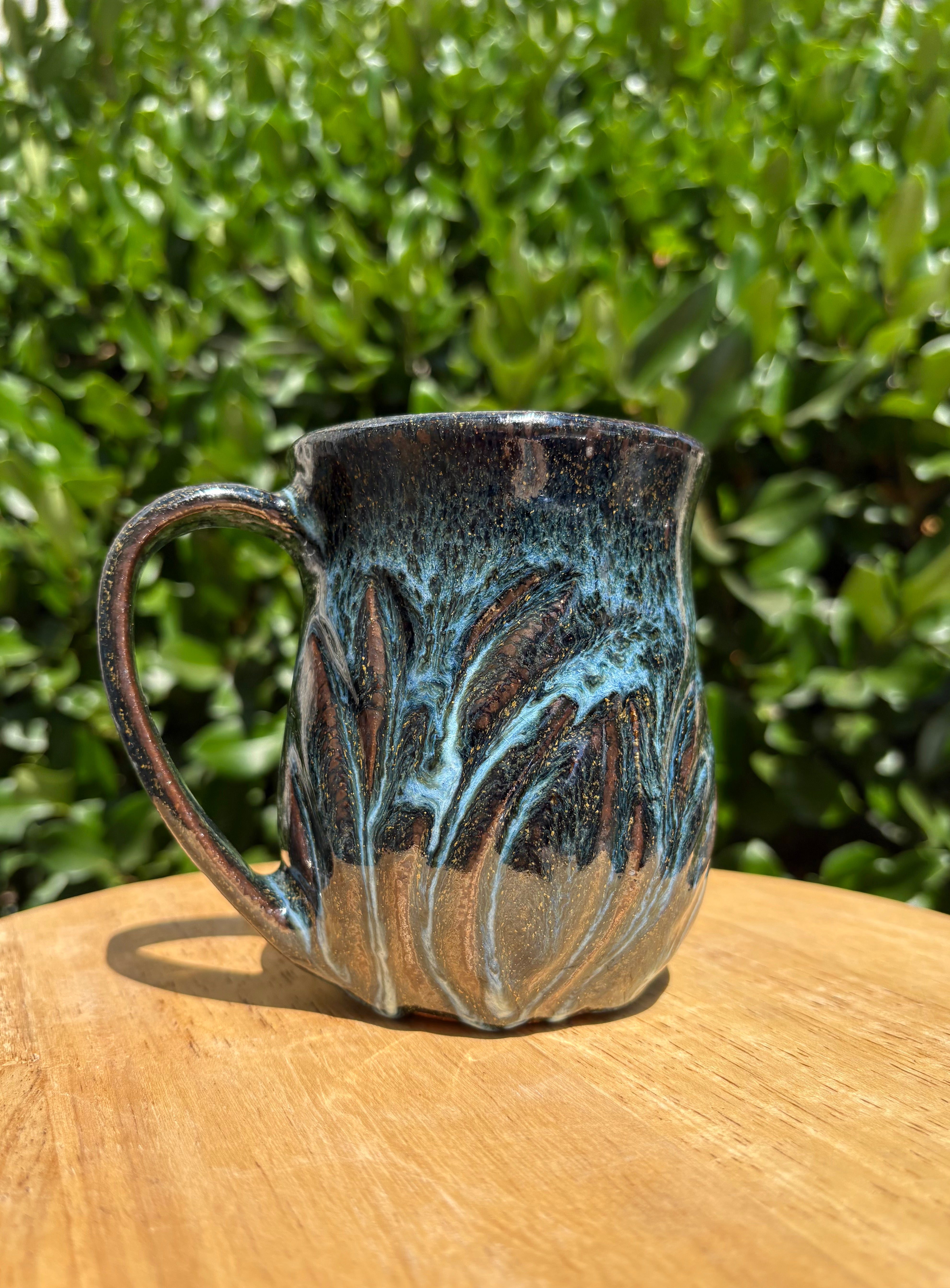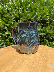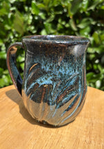Handmade, wheel thrown mug with carvings - microwave and dishwasher safe, holds ~ 12oz