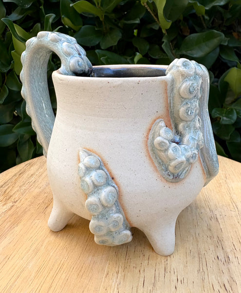 This handmade mug is perfect for bringing a bit of spooky season with you throughout the year. The glaze for this mug had a unique reaction during a refire in the kiln and is truly one of a kind. It is microwave and dishwasher safe and holds roughly 10 oz. *no octopus were harmed in the making of this mug*